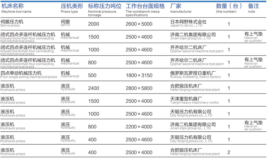 公司拥有11台大台面压机,4台成线的机械压机,可对模具进行联线调试,拥有2000吨伺服压机,